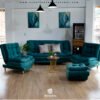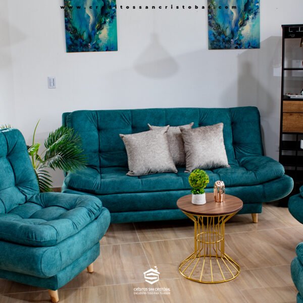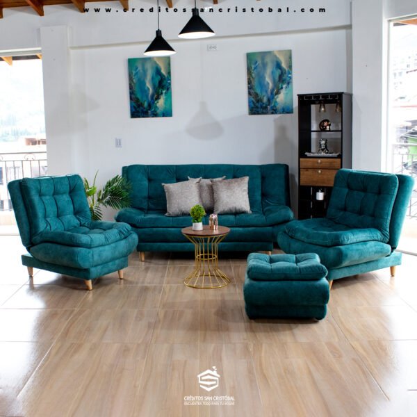 Sofá, 2 poltronas y puff con cojines decorativos.