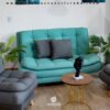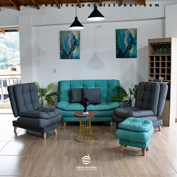 Sofá, 2 poltronas y puff con cojines decorativos.