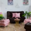 Sofá, 2 poltronas y puff con cojines decorativos.
