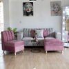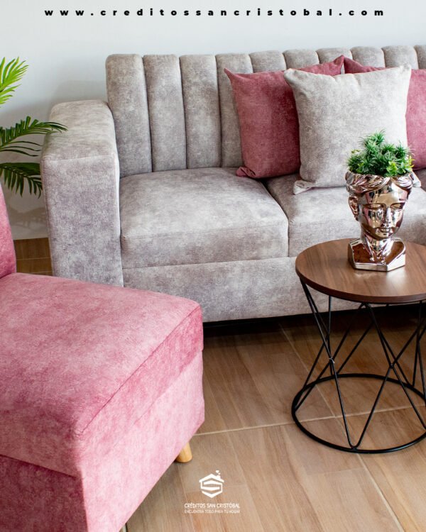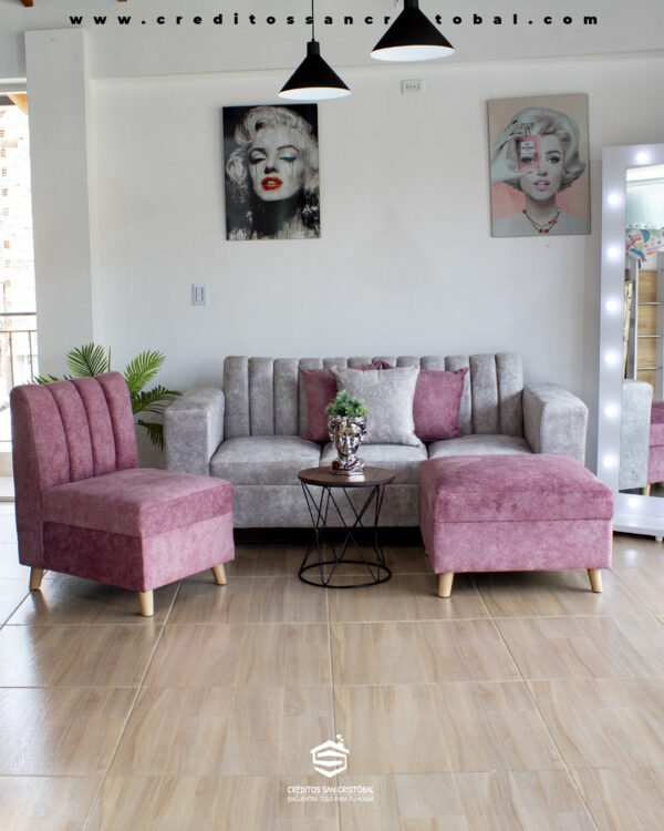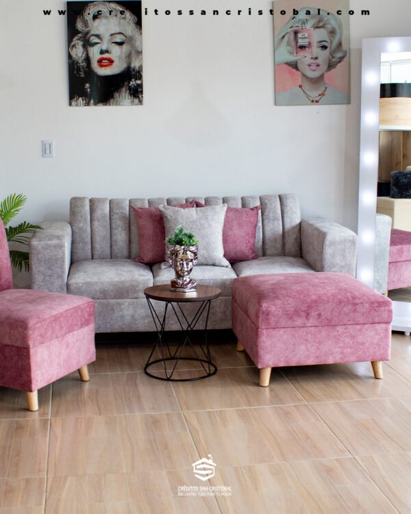 Las elegantes patas de madera, sofá, 1 poltrona, 1 Puff y cojines. 🌟